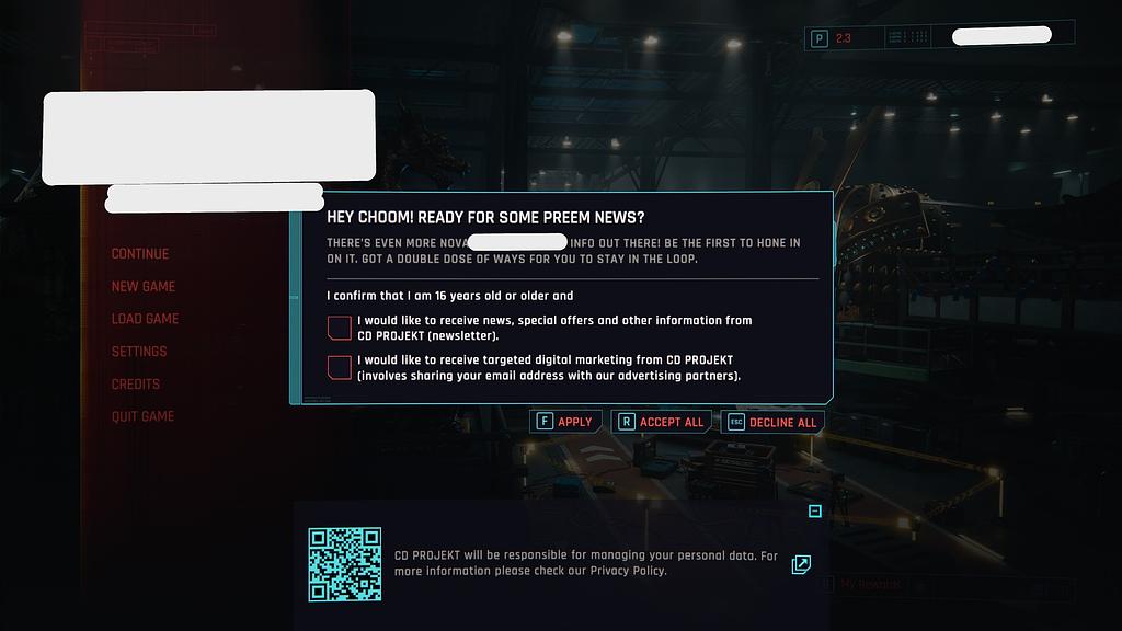 Autre exemple européen, en Pologne, le plus célèbre des jeux cyberpunk a récemment été mis à jour avec une bannière de consentement extrêmement claire :