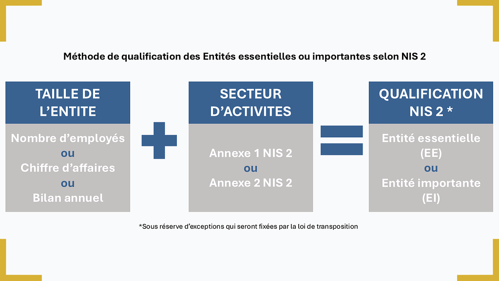La qualification de votre entité repose sur des critères de taille (nombre d’ETP, CA annuel de l’année passée, bilan annuel de l’année passée) et de secteur d’activités dans lequel vous exercez (secteurs dits « à haute criticité » ou « autres secteurs critiques »).