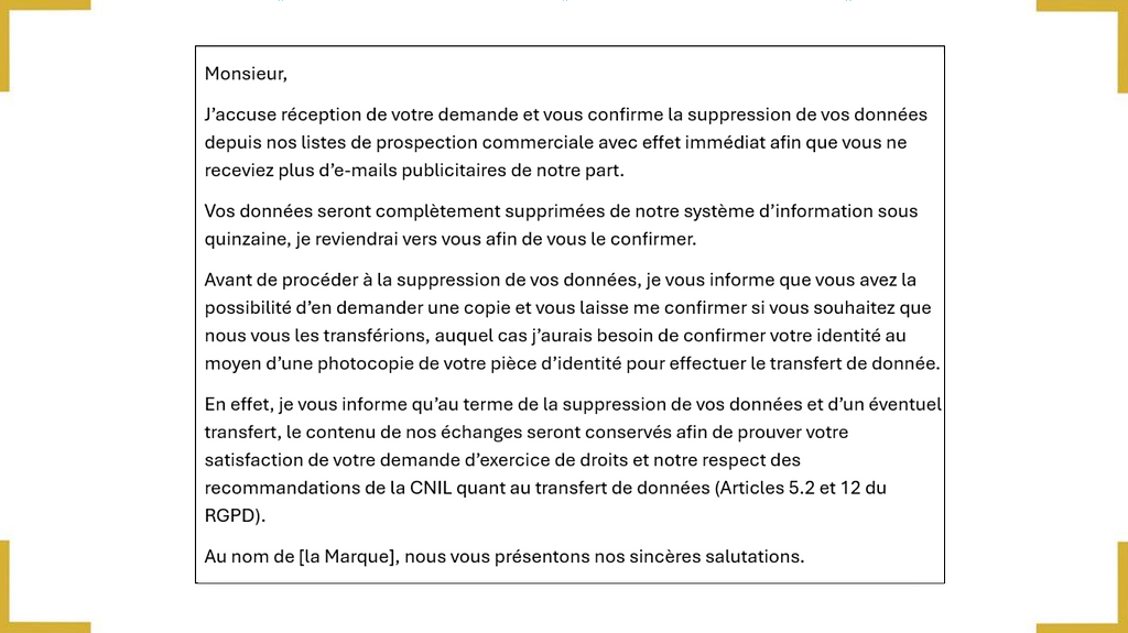 En premier lieu, il faut garder en tête qu’une réponse doit être émise dans un délai d’un mois -pouvant être prolongé de deux mois supplémentaires en cas de situation complexe-, faute de quoi la Marque se trouverait en violation de ses obligations RGPD.